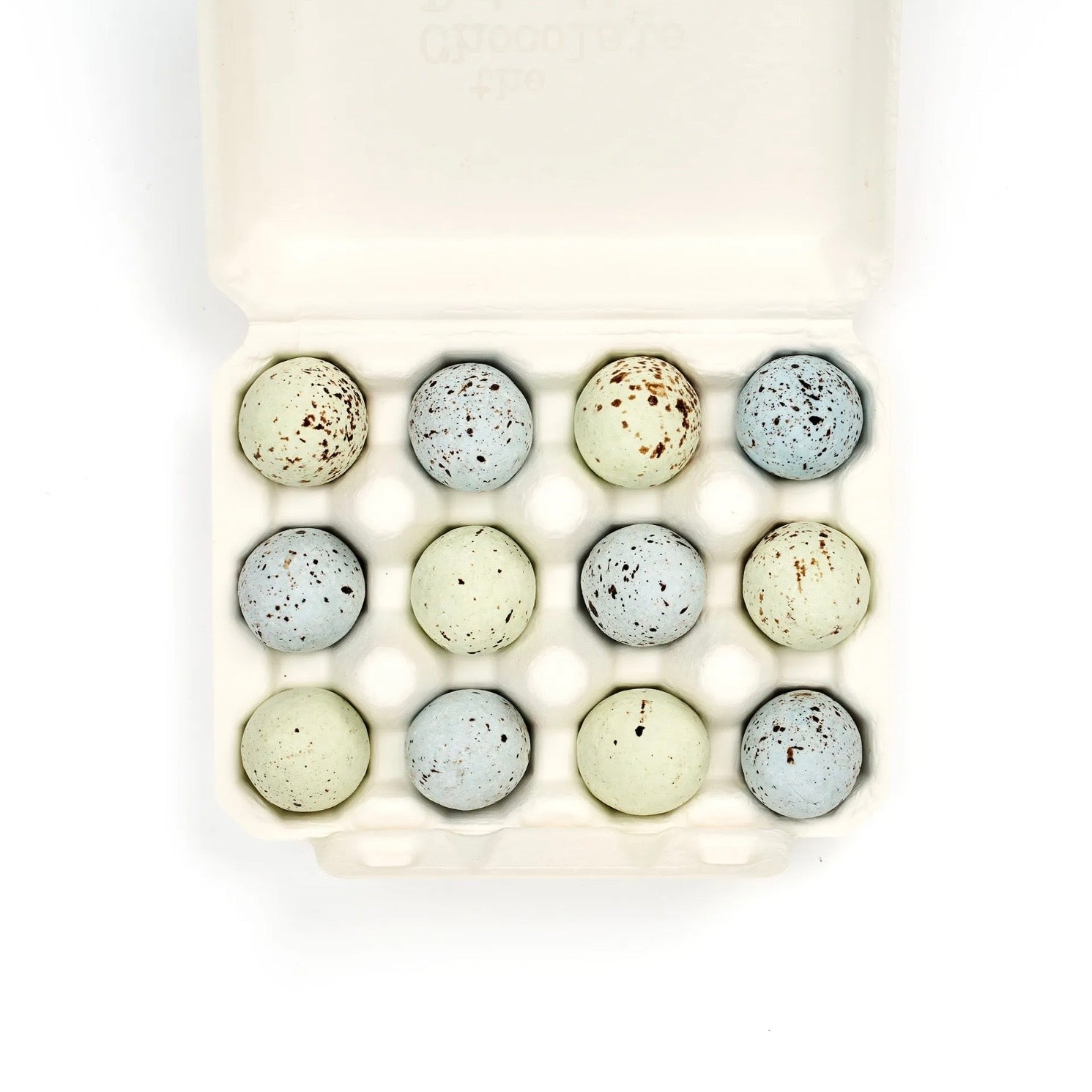 12 Chocolate Eggs, 6 filled with a fine hazelnut praline and 6 with a subtle salted caramel. A layer of milk and dark chocolate is filled with caramel or praline and then wrapped in a fine sugar shell and life-like speckles. Please note that colour combinations may vary seasonally.
